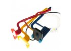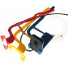 Sada držáků pro RVG senzory značky TROLL DENTAL. Tři zaměřovací ramena (modré, žluté, červené), zaměřovací prstenec a skusový blok.